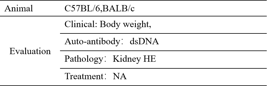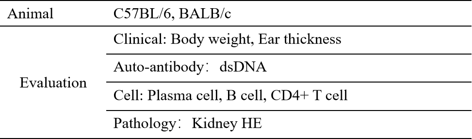 | ● Modelo SLE C57BL/6 inducido por Pristane 【Mecanismo】 Pristane es un aceite mineral que se administró por vía intraperitoneal en ratones C57BL/6 para inducir irritación peritoneal y mejorar la producción de anticuerpos monoclonales de la ascitis cuando se inyectaron posteriormente hibridomas. Satoh et al observaron que los ratones inyectados con pristano, después de varios meses, desarrollaron una enfermedad similar al lupus con glomerulonefritis por complejos inmunes, artritis erosiva leve y muchos autoanticuerpos asociados al lupus.