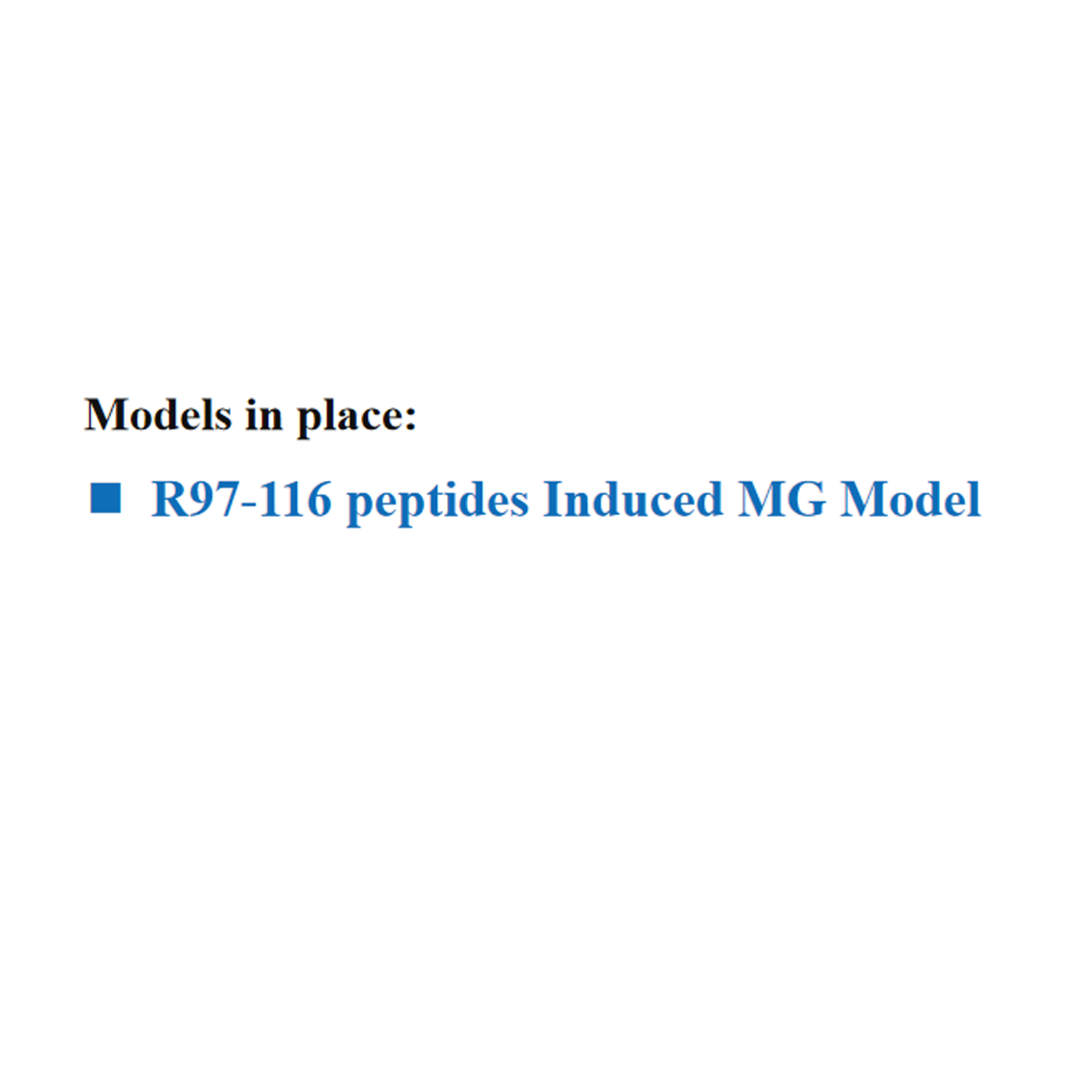| ● R97-116 peptidek által indukált MG modell 【Mechanizmus】 A myasthenia gravis (MG) egy antitest által közvetített, T-sejt-függő, komplementek által érintett autoimmun betegség, amelyet az acetilkolin receptor (AChR) elvesztése jellemez a neuromuszkuláris junctió posztszinaptikus membránján, ami károsodott neuromuszkuláris átvitelhez és izomgyengeséghez vezetett. Kísérleti autoimmun myasthenia gravis (EAMG) indukálható Lewis patkányokban torpedo acetilkolin receptorral (TAChR) vagy a patkány AChR α alegységének 97-116. régiójának megfelelő szintetikus peptiddel (R97-116 peptid) végzett immunizálással, amely nem alkalmas az MG terápiás vizsgálatára, és nem megbízható modell az emberi MG kifejlesztésére. stratégiákat.