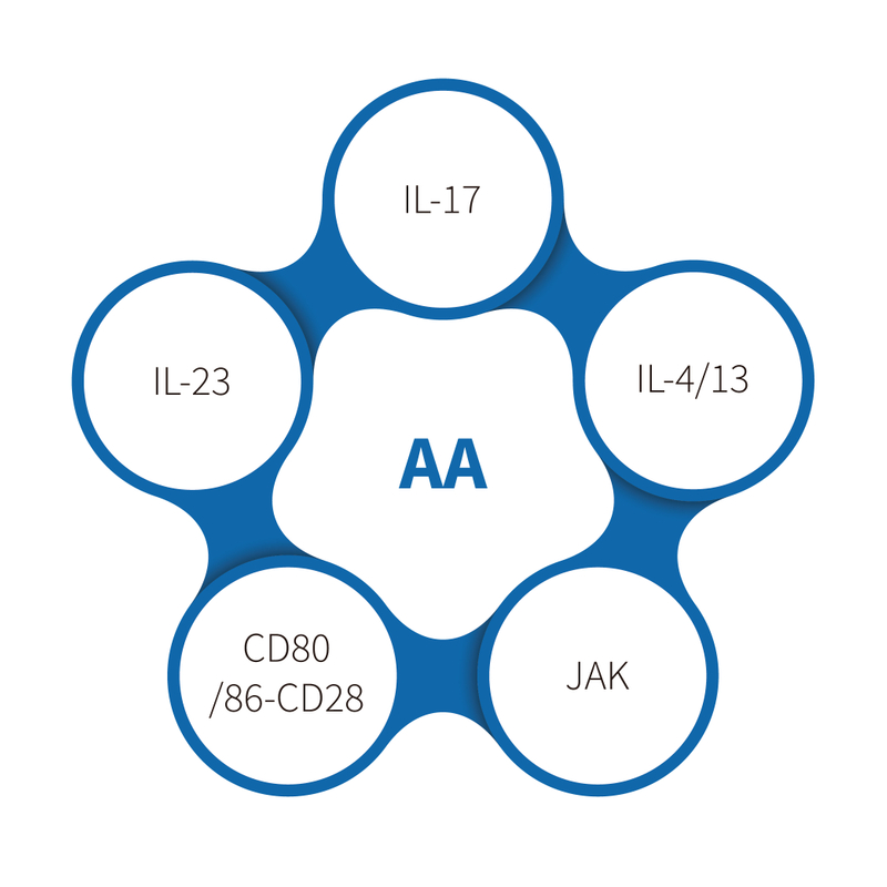 Pada AA, faktor stimulasi dapat mengaktifkan sel T CD8 + NKG2D + dan memproduksi IFN-γ melalui jalur JAK1 dan JAK3. IFN-γ dapat meningkatkan produksi IL-15 pada sel epitel folikel melalui JAK1 dan JAK2. IL-15 kemudian berikatan dengan sel CD8 + NKG2D + T untuk menghasilkan lebih banyak IFN-γ, yang memperkuat loop umpan balik positif. IFN-γ mendorong keruntuhan hak imun folikel rambut, yang menyebabkan paparan autoantigen ke sel T CD8+NKG2D+ dan memfasilitasi serangan autoimun pada folikel rambut. Sementara itu, sel inflamasi lainnya, seperti DC, sel T CD4+, sel T NK, sel mast, dan eosinofil, menumpuk di sekitar umbi rambut.