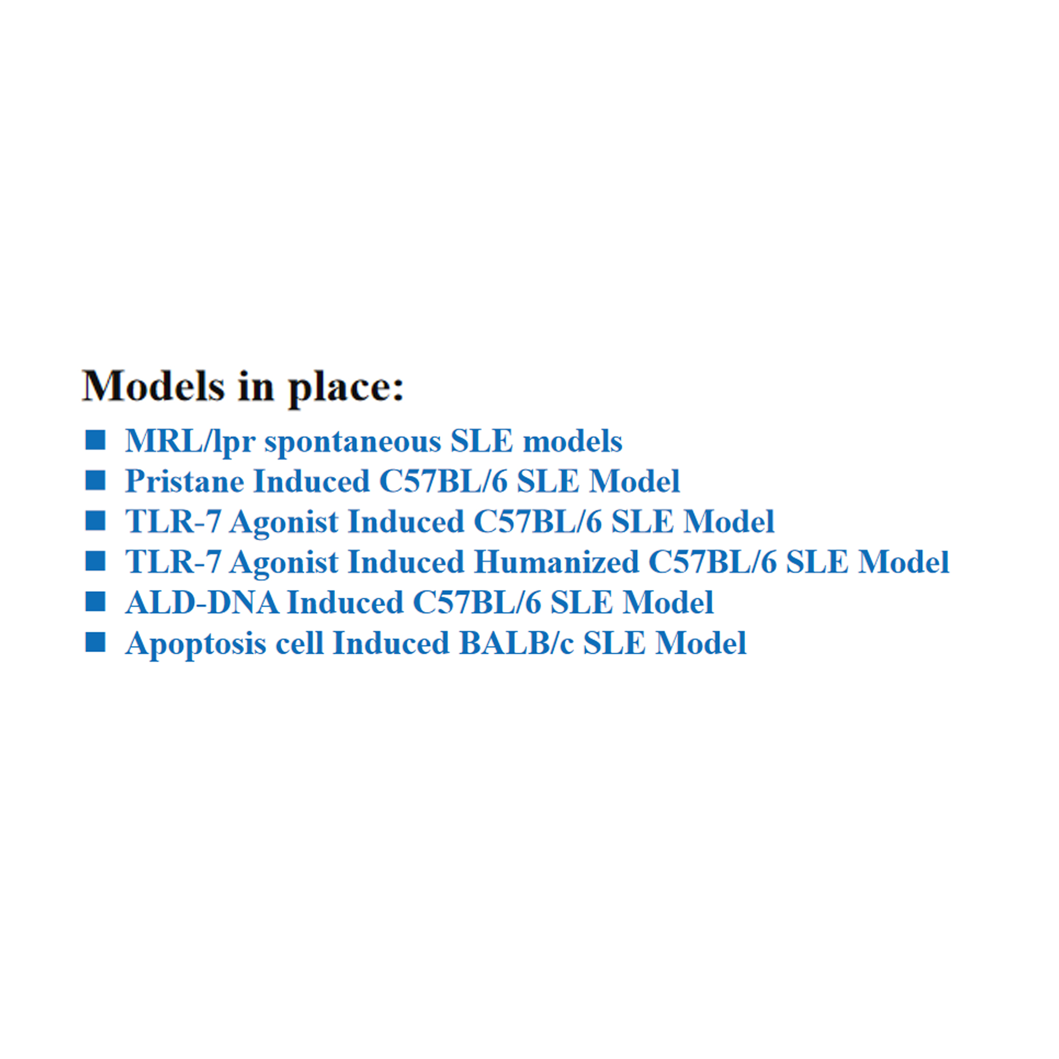 | ● Model C57BL/6 SLE indukowany Pristanem 【Mechanizm】 Pristan to olej mineralny podawany dootrzewnowo myszom C57BL/6 w celu wywołania podrażnienia otrzewnej i zwiększenia produkcji przeciwciał monoklonalnych z wodobrzusza po późniejszym wstrzyknięciu hybrydom. Satoh i wsp. zauważyli, że u myszy, którym wstrzyknięto prystan, po kilku miesiącach rozwinęła się choroba przypominająca toczeń z kłębuszkowym zapaleniem nerek z kompleksami immunologicznymi, łagodnym nadżerkowym zapaleniem stawów i wieloma autoprzeciwciałami związanymi z toczniem.